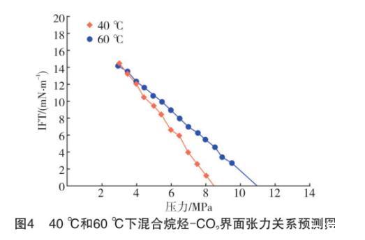 Kazemzadeh Y等的研究表明,平衡的CO2氣-油系統(tǒng)的界面張力通常隨著壓力線性降低,直到界面張力-壓力趨勢(shì)發(fā)生變化時(shí),這時(shí)的壓力稱(chēng)為臨界壓力,但界面張力為零的瞬間很難捕捉到。本實(shí)驗(yàn)中,在溫度為40℃、壓力為8.5 MPa時(shí),可以觀察到滴液針管中的混合烷烴不再形成橢圓形液滴,直接和CO2發(fā)生混溶而無(wú)斷續(xù)地流入釜中,所以無(wú)法通過(guò)實(shí)驗(yàn)測(cè)量準(zhǔn)確地得到CO2和混合烷烴界面張力為0時(shí)的對(duì)應(yīng)壓力,即最小混相壓力。因此,采用外推法預(yù)測(cè)最小混相壓力。以橫軸為壓力值,縱軸為混合烷烴在被鹽水飽和的CO2環(huán)境下界面張力值的坐標(biāo)系中分別繪制40℃和60℃壓力和界面張力的散點(diǎn)圖,如圖4。從圖4可看出,隨著壓力的升高,界面張力呈線性降低的趨勢(shì)。