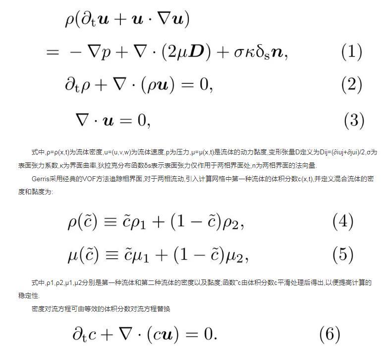 液滴撞擊液池的運動過程可以使用帶有表面張力項的變密度、不可壓縮Navier-Stocks方程來描述,具體控制方程如下: