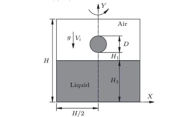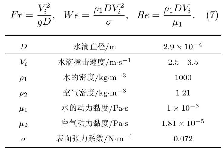 如圖1所示,水滴撞擊深水液池的數(shù)值模擬在軸對稱坐標(biāo)系中進(jìn)行,Y軸為計算區(qū)域的對稱軸,D為初始水滴直徑,R=D/2,正方形計算區(qū)域的長度H=20D,水滴距離液面的距離H1=0.1D,液池深度H2=12D以消除底部對液滴撞擊運動的影響,水滴在重力g和撞擊速度Vi的作用下撞擊液池。采用雷諾數(shù)、韋伯?dāng)?shù)和弗勞德數(shù)來描述液滴撞擊的運動特征,三者分別表征液體慣性力與黏滯力間的關(guān)系、液體慣性力與表面張力間的關(guān)系以及液體慣性力與重力間的關(guān)系。三個無量綱參數(shù)的表達(dá)式如(7)式所示,主要物理參數(shù)如表1所列。