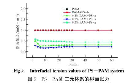 由圖5結(jié)果可知,PAM單元體系以及PAMPS-b二元體系,均不能降低原油的界面張力;為了便于在圖形中對(duì)比分析,將其界面張力設(shè)定為1.0 mN/m而PAM-PS-a二元體系可以將原油的界面張力維持在10-1數(shù)量級(jí),數(shù)值與PS-a單元體系的界面張力數(shù)值相近,因此可以得出:無論是PS單元體系,還是PAM-PS復(fù)配體系,PS-b均不能降低原油的界面張力。