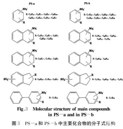 對(duì)于PS-b,相對(duì)含量較大的20個(gè)化合物中,按照相對(duì)含量大小依次為:烷基萘磺酸鹽(C17~C21)、烷基苯磺酸鹽(C17~C24)、烷基茚滿磺酸鹽(C17~C21)、烷基四氫萘磺酸鹽(C19~C20);而對(duì)于PS-a,按照相對(duì)含量大小依次為:烷基苯磺酸鹽(C11~C13、C18~C23)、烷基萘磺酸鹽(C12、C18~C20)、烷基茚滿磺酸鹽(C16~C18)、烷基四氫萘磺酸鹽(C13、C17~C18)。