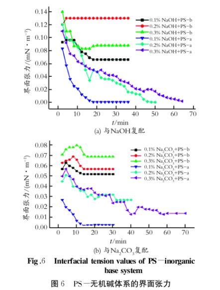 由圖6可以看出:PS-b與NaOH復(fù)配,原油的界面張力只可以降到10-2數(shù)量級(jí),而PS-a與NaOH復(fù)配,可以將原油的界面張力降至10-4數(shù)量級(jí);PS-b與Na2CO3復(fù)配,原油的界面張力可以降到10-2數(shù)量級(jí);PS-a與Na2CO3復(fù)配,可以將原油的界面張力降至10-3數(shù)量級(jí)。綜上分析可以得出:PS-b的界面活性遠(yuǎn)遠(yuǎn)低于PS-a;PS-a的復(fù)配體系可以達(dá)到超低界面張力(10-3~10-4mN/m),而PS-b不能。