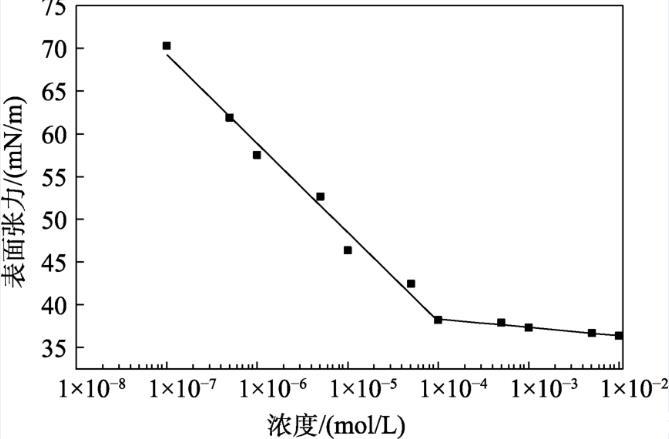 配制不同濃度TAC水溶液,測定溫度298.15 K,繪制溶液的表面張力隨濃度的變化曲線。在某一濃度前后,表面張力-濃度曲線會(huì)形成兩條斜率不同的直線,這兩條直線的交點(diǎn)即為臨界膠束濃度(CMC)。