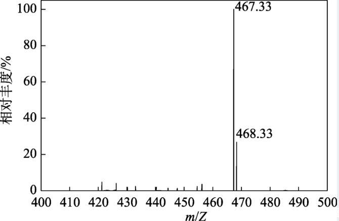 圖4為TAC的MS譜圖。從圖4可以看出,在正離子檢測模式下檢測到最大豐度的質(zhì)譜信號(hào)為m/Z=467.33,m/Z=468.33為[M+1],即正峰MS信號(hào)。TAC相對分子質(zhì)量測量值與計(jì)算值一致。