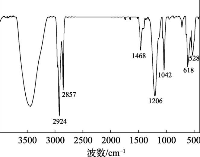 圖1為TAC的FTIR譜圖。從圖1可以看出,2924 cm–1處為主鏈甲基的C—H鍵的伸縮振動(dòng)吸收峰;2857 cm–1處為主鏈亞甲基C—H鍵的伸縮振動(dòng)吸收峰;1468 cm–1處為甲基和亞甲基C—H鍵的面內(nèi)搖擺振動(dòng)吸收峰;1206 cm–1為磺酸基團(tuán)中C—S鍵的不對稱伸縮振動(dòng)吸收峰;1042 cm–1處為胺基C—N鍵的面內(nèi)彎曲振動(dòng)吸收峰,表明TAC結(jié)構(gòu)中存在季銨基。618和528 cm–1處為—SO 3-的中強(qiáng)吸收峰,表明TAC結(jié)構(gòu)中存在磺酸基。上述結(jié)果表明,TAC符合預(yù)先設(shè)計(jì)的結(jié)構(gòu)。