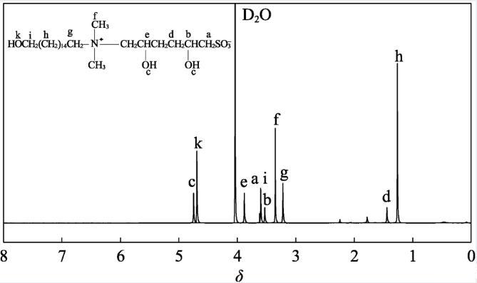 圖2為TAC的1 HNMR譜圖。從圖2可以看出,δ3.60(a)為TAC中—CH 2 SO–3的質(zhì)子峰,δ3.50~3.87(b、e)為TAC中—CH—的質(zhì)子峰,δ4.70~4.77(c、k)為TAC中—OH的質(zhì)子峰,δ1.40(d)為TAC中—CH 2 CH 2—的質(zhì)子峰,δ3.30(f)為TAC中N—(CH 3)2的質(zhì)子峰,δ3.22(g)為TAC中N—CH 2的質(zhì)子峰,δ1.26(h)為TAC中—(CH 2)14—的質(zhì)子峰,δ3.62(i)為TAC中—CH 2—的質(zhì)子峰。