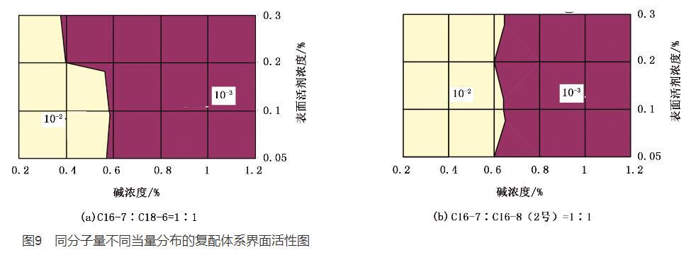 2)同分子量不同當(dāng)量分布的表面活性劑界面活性范圍從圖8和圖2對(duì)比可以得出,表面活性劑平均相對(duì)分子量為432時(shí),C18-6測(cè)得表面活性劑與堿濃度范圍很寬的超低界面活性范圍,而C16-8(2號(hào))超低界面活性范圍的堿濃度相對(duì)于C18-6變窄。同理,在試驗(yàn)用表面活性劑的復(fù)配體系中,試驗(yàn)圖9表明平均相對(duì)分子量為425時(shí),C16-7與C18-6的復(fù)配體系形成超低界面活性范圍寬于C16-7與C16-8(2號(hào))的復(fù)配體系。說(shuō)明平均相對(duì)分子量相同當(dāng)量分布不同的表面活性劑界面活性范圍也不相同。