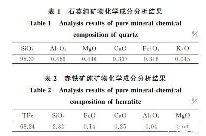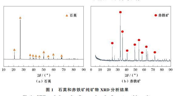 由表1可知,石英純礦物樣品中SiO2含量為98.37%,樣品中含有少量Al、Mg及其他微量元素,因此石英樣品可視為純礦物,滿足試驗要求。由表2可知,赤鐵礦中TFe含量為68.24%,樣品中含有少量Si及其他微量元素,雜質(zhì)含量較少,因而赤鐵礦樣品可視為純礦物。