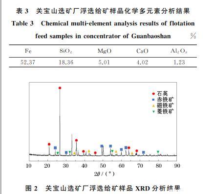試驗所用礦石為關(guān)寶山鐵礦,具有礦物組成復(fù)雜、嵌布粒度細、分選難度大等特點。關(guān)寶山選礦廠浮選給礦樣品經(jīng)自然陰干后進行混勻縮分取樣,其化學(xué)多元素分析結(jié)果見表3.由表3可知,浮選給礦中Fe含量為52.37%,脈石礦物以含硅礦物為主,SiO2含量為18.36%;其次為含鈣及含鎂礦物,MgO、CaO含量分別為5.01%、4.02%.關(guān)寶山選礦廠浮選給礦樣品XRD分析結(jié)果如圖2所示。由