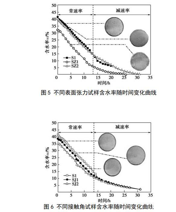 把篩好的土放入105℃烘箱內(nèi)烘至恒重備用。設(shè)計(jì)土樣的干密度為1.5 g/cm3,含水率計(jì)算不考慮酒精溶液和肥皂水引起的液體密度變化,制樣含水率為16%~18%。采用輕型擊實(shí)儀制圓柱試樣,試樣直徑為102 mm,高40 mm,試樣制好后用真空飽和法進(jìn)行飽和,其中,SZ1樣用20%酒精溶液飽和,SZ2樣用濃度為2 g/L的肥皂水飽和,其余試樣均為純水飽和,抽氣時(shí)間為6 h,試樣在真空下的浸泡時(shí)間為12 h。為縮短試樣的脫濕時(shí)間以減小酒精揮發(fā)造成的濃度降低,飽和試樣脫濕采用低溫烘干法,烘箱的溫度控制在50℃(小于酒精的沸點(diǎn)和十八胺的熔點(diǎn)),當(dāng)2h內(nèi)試樣的質(zhì)量變化量不超過2 g時(shí)停止試驗(yàn)。試驗(yàn)開始后,前8 h每隔30 min把試樣從烘箱中取出后先稱重,隨后進(jìn)行拍照記錄,稱重和拍照的時(shí)間控制在30s內(nèi),拍照結(jié)束后把試樣放入烘箱繼續(xù)脫濕,6 h以后拍照間隔時(shí)間增加為1 h。2試驗(yàn)結(jié)果2.1水分蒸發(fā)與臨界含水率圖5給出了不同表面張力的3種試樣含水率隨時(shí)間變化的關(guān)系曲線。