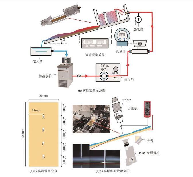 本實驗的實驗裝置,如圖3(a)所示。該裝置主要由液體回路、布液器和實驗段三大部分組成。液體回路用于提供不同的流動條件,以確保布液器能夠穩(wěn)定形成液膜。在這個回路中,液體從恒溫水箱(Julabo-Vivo RT2)中流出,恒溫水箱提供一個穩(wěn)定的入口溫度,由齒輪泵(Cole-parmer)控制液體流量大小,液體再流入流量計(Micro motion 2700,精度為±0.05%),流量計監(jiān)測管道內(nèi)液體的質(zhì)量流量,在布液器的入口端放置一個T型熱電偶(精度為±0.5℃)來測量入口溫度的變化,最后使用數(shù)據(jù)采集器(Keithely 2700)采集流量計的質(zhì)量流量、熱電偶的溫度和加熱片的功率。本實驗對入口溫度要求較高,所以采用一些保溫措施,在不銹鋼管和布液器腔室周圍包裹一層保溫棉,減少熱量損失。