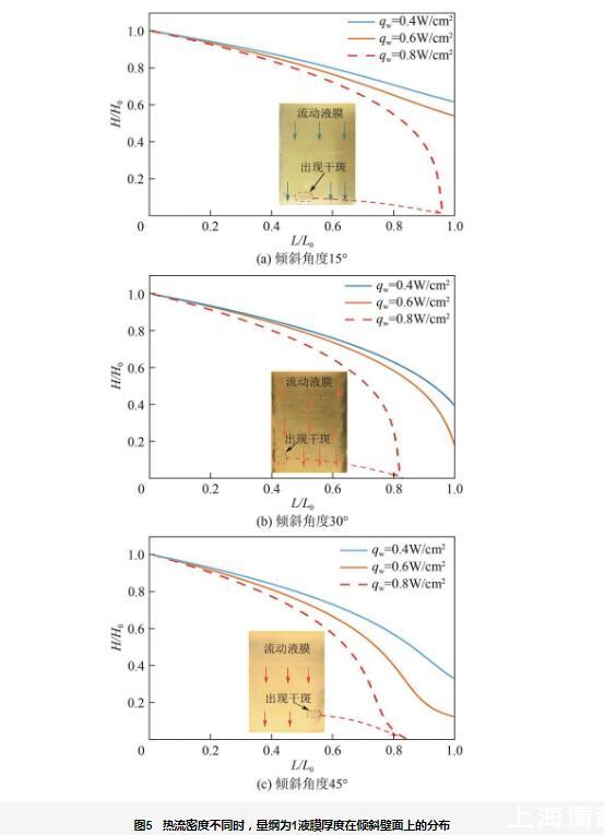 圖5所示的數(shù)學(xué)模型中,壁面傾斜角度分別為15°、30°和45°,噴淋密度為0.016kg/(m·s)、0.03kg/(m·s)和0.04kg/(m·s),入口溫度為70℃。通過施加不同的熱流密度加熱壁面,模型計算得出了量綱為1液膜厚度在傾斜壁面上的分布情況。結(jié)果顯示,當(dāng)熱流密度qw=0.8W/cm2時,不同傾斜角度下的壁面上量綱為1液膜厚度均逐漸減小,最終降至零,出現(xiàn)了燒干現(xiàn)象。同時,模型計算結(jié)果與實驗結(jié)果相符,干斑位置均出現(xiàn)在壁面底部,這一現(xiàn)象的產(chǎn)生不僅是由于蒸發(fā)的作用,還與熱毛細效應(yīng)密切相關(guān)。在加熱過程中,熱毛細效應(yīng)促進了液膜表面張力的變化,使得液膜的穩(wěn)定性減弱,導(dǎo)致液膜局部破裂。隨著蒸發(fā)效應(yīng)的增強,液膜厚度逐漸減小,特別是在液膜的薄弱區(qū)域,蒸發(fā)速率提高,導(dǎo)致液膜厚度進一步減小,最終在底部區(qū)域發(fā)生破裂。因此,干斑通常出現(xiàn)在壁面底部,這進一步驗證了實驗結(jié)果與數(shù)學(xué)模型計算之間的良好一致性,并表明所建立的數(shù)學(xué)模型能夠有效預(yù)測液膜在傾斜加熱壁面上的流動行為和燒干現(xiàn)象。
