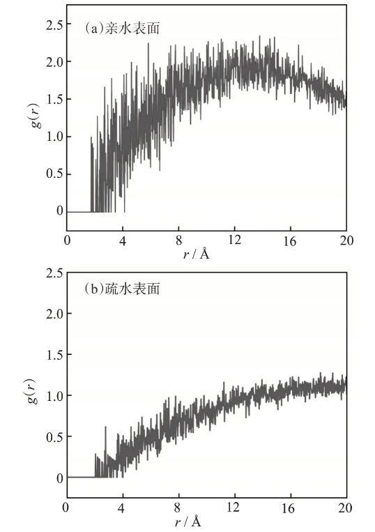 為了進(jìn)一步揭示鼠李糖脂分子與親水、疏水表面之間的相互作用以及成鍵模式,計(jì)算了鼠李糖脂分子與不同潤濕性表面的徑向分布函數(shù)[g(r)]。計(jì)算以動(dòng)力學(xué)模擬1000 ps后的穩(wěn)定結(jié)構(gòu)為基礎(chǔ),結(jié)果如圖5所示。對于親水表面,鼠李糖脂分子距離1.3~2.0?的范圍內(nèi)出現(xiàn)了明顯的峰,表明分子與該表面在此范圍內(nèi)有新鍵生成,作用力較強(qiáng)。這主要是由于親水表面的羥基基團(tuán)與鼠李糖脂親水環(huán)之間存在氫鍵作用。2.0?之后的峰主要由范德華力和靜電作用形成,從而產(chǎn)生了較高的吸附結(jié)合能(E=29.7 eV)。對于疏水表面,g(r)在2.0?之內(nèi)均沒有明顯的峰,說明疏水表面與鼠李糖脂分子之間并沒有氫鍵生成,只有范德華力和靜電相互作用等弱作用力。這是由于疏水表面的十八烷基長鏈分布松散,與鼠李糖脂分子的相互作用較弱,在界面處疏水基團(tuán)與鼠李糖脂分子間形成薄層空隙,導(dǎo)致結(jié)合能較低(E=12.2 eV)。