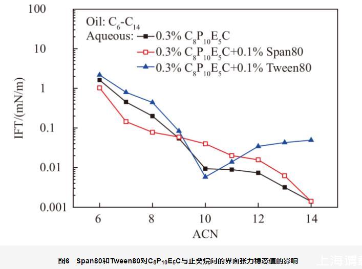 由于微膠囊靶向增黏聚合物是以非離子表面活性劑Span80和Tween80為乳化劑制備的,因此,以C8P10E5C為例,分別考察了0.1%的Span80和Tween80對(duì)0.3%C8P10E5C溶液與系列正構(gòu)烷烴間界面張力穩(wěn)態(tài)值的影響,結(jié)果如圖6所示。
