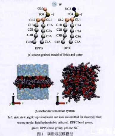 本文利用粗?;肿觿恿W模擬方法,考察表面張力強度為80×10?5N·cm?1條件下磷脂膜的破裂過程。通過建立磷脂膜破裂臨界時間和臨界表面張力值的分析方法,采用電中性的二棕櫚酰磷脂酰膽堿(dipalmitoyl phosphatidylcholine,DPPC)和帶負電的二棕櫚酰磷脂酰甘油(dipalmitoyl phosphoglycerol,DPPG)作為磷脂膜組分,考察表面張力施加速率以及磷脂膜組成對磷脂膜破裂行為的影響規(guī)律。進一步地,提出“動態(tài)”微觀對抗理論以描述磷脂膜破裂過程的動力學,旨在為磷脂膜和磷脂膜元件的設計及其應用提供理論指導。
