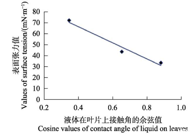 采集新鮮的芒果葉片,新老葉比例1∶1,取其平整部分且不破壞其葉面結(jié)構(gòu),用雙面膠將其固定在載玻片上構(gòu)成平面,使葉面保持自然狀態(tài)。分別將水、二甲基甲酰胺(DMF)、二甲基亞砜(DMSO)3種液體通過微量注射器滴加到葉面上,當(dāng)液體在葉面形成液滴后,通過接觸角測定儀拍照后測量其接觸角。從滴加樣品到測得接觸角在5 s內(nèi)完成,每個(gè)處理重復(fù)10次,取平均值。液體的表面張力值通過表面張力儀測定,每個(gè)處理重復(fù)5次,取平均值。將測得的水、DMF、DMSO液體表面張力值和接觸角的cosθ值分別為橫縱坐標(biāo)作圖,獲取回歸方程,當(dāng)接觸角為零時(shí)求得芒果葉的臨界表面張力值。為確保液滴的完整性和穩(wěn)定性,整個(gè)測定過程的溫度保持在25~28℃,相對(duì)濕度為80%左右的封閉環(huán)境下進(jìn)行。