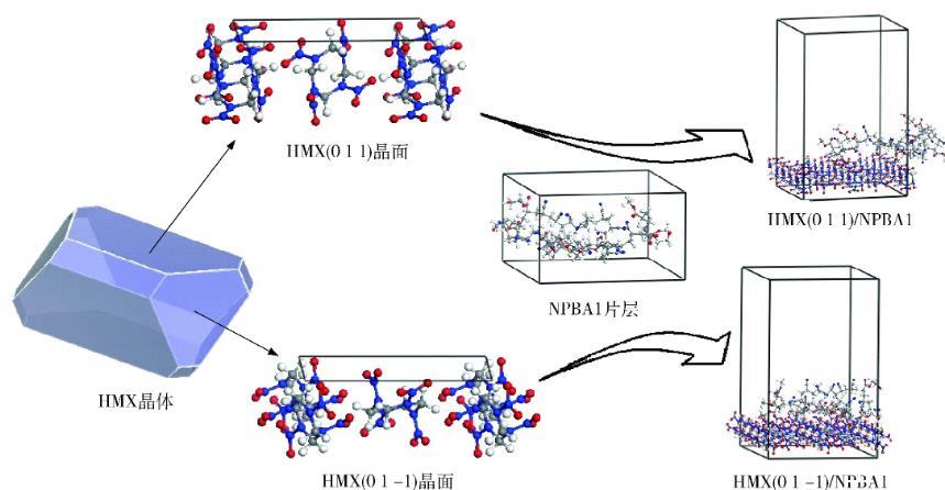 由于實際HMX以晶體的形式存在,因此在建立HMX吸附NPBA界面模型時,首先根據(jù)β-HMX的晶體衍射數(shù)據(jù),構(gòu)建HMX初始晶胞,模擬HMX的晶體形貌,確定HMX晶體的主要晶面后,擴(kuò)建超晶面;然后,建立包含1條分子鏈的NPBA片層模型,將超晶面與片層模型復(fù)合,構(gòu)建HMX吸附NPBA的6個界面模型,具體細(xì)節(jié)如2.1.1節(jié)中所述。3種NPBA的分子結(jié)構(gòu)式及其模型見圖1,HMX超晶面、NPBA片層模型及界面模型見圖2,其余略。