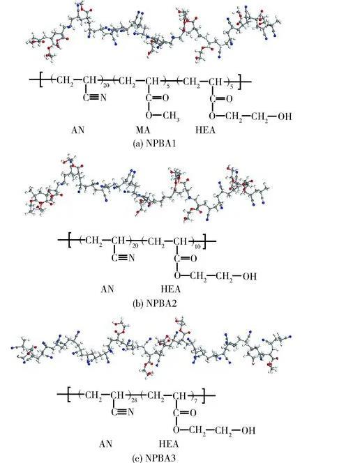 利用美國Accelrys公司Materials Studio軟件建立NPBA分子模型時,NPBA1聚合單元AN、MA和HEA的數(shù)目分別為20、5和5,NPBA2聚合單元AN和HEA的數(shù)目分別為20和10,NPBA3聚合單元AN和HEA的數(shù)目分別為28和7,NPBA分子模型上各類聚合單元均為隨機(jī)分布。此時3種NPBA分子模型的摩爾鏈節(jié)比分別為4∶1∶1、2∶1和4∶1,且相對分子質(zhì)量均為2 300左右,使得所構(gòu)建的模型與實際物質(zhì)具有較好的對應(yīng)關(guān)系。