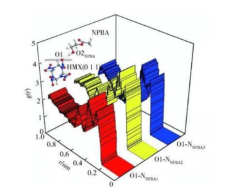 對于NPBA與HMX晶體界面間的分子間相互作用力情況,可通過計(jì)算體系內(nèi)各原子對的徑向分布函數(shù)g(r)予以分析。徑向分布函數(shù)是反映材料微觀結(jié)構(gòu)的特征物理量,它表示在距離某一設(shè)定中心粒子A為r處,另一設(shè)定粒子B的數(shù)目密度與B平均數(shù)目密度的比值,即