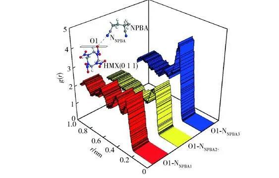 HMX(0 1 1)晶面上—NO2基團(tuán)中氧原子O1與NPBA分子鏈上—CN基團(tuán)上氮原子NNPBA之間的徑向分布函數(shù)曲線見圖3.