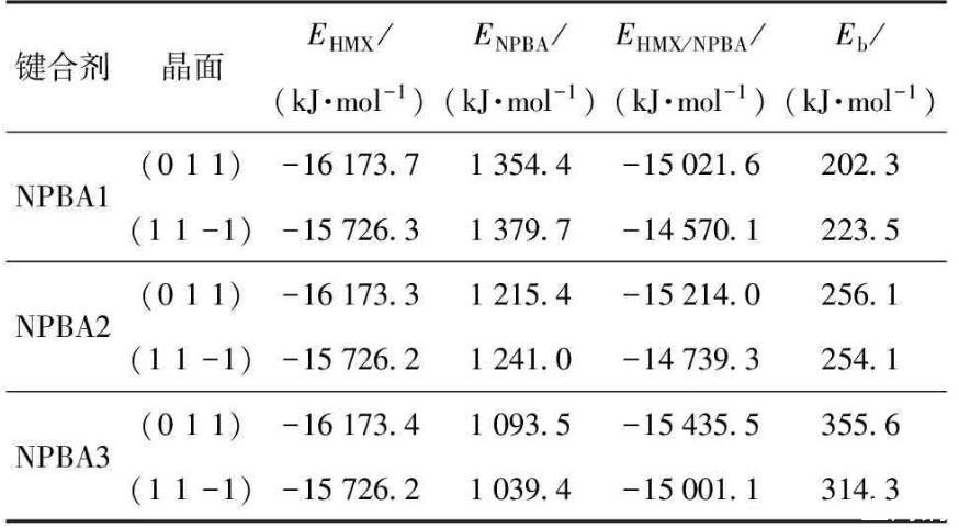 結(jié)合能是表征混合體系組分間相互作用力強(qiáng)度的特征參數(shù),HMX吸附NPBA界面模型的結(jié)合能越大,表明界面間的相互作用越強(qiáng)。結(jié)合能Eb=(EHMX+ENPBA)-EHMX/NPBA,其中EHMX、ENPBA和EHMX/NPBA分別為界面模型中HMX晶面、NPBA以及界面模型的平均單點(diǎn)能。6種界面模型結(jié)合能的模擬計(jì)算結(jié)果見表2.