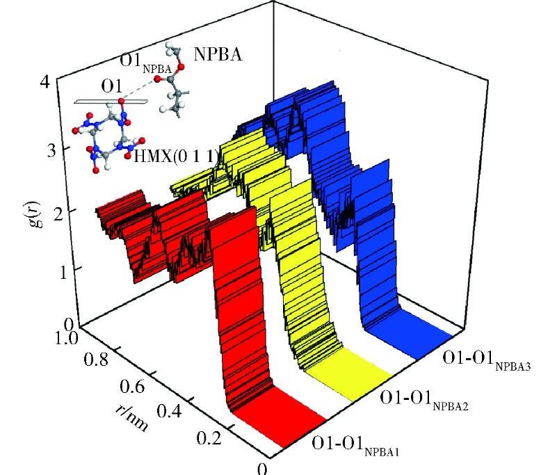 由于體系的原子種類較多,考慮到篇幅因素,且相對于氮原子,—NO2基團(tuán)中氧原子與其他極性分子間的作用力更強(qiáng),為此僅選取了HMX(0 1 1)晶面上—NO2基團(tuán)中氧原子,對其與NPBA分子基團(tuán)上極性原子間的徑向分布函數(shù)進(jìn)行了計(jì)算,并根據(jù)徑向分布函數(shù)曲線峰的位置和高低判斷原子間的作用力類型和強(qiáng)弱。