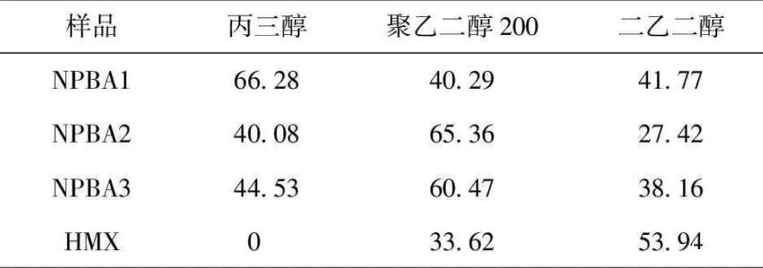 由表5可知,NPBA3與HMX的粘附功最大(113.34 mN/m),且界面張力最小(4.81 mN/m),表明3種NPBA中NPBA3與HMX的浸潤性(粘結(jié)性)最好,且外力破壞粘接界面需做的功(粘結(jié)強(qiáng)度)最大。與NPBA1相比,雖然NPBA2與HMX的粘附功相對較大(分別為75.06 mN/m和78.38 mN/m),但其界面張力相對也大(分別為21.51 mN/m和24.12 mN/m),表明NPBA2與HMX的粘結(jié)強(qiáng)度大于NPBA1,但浸潤性略弱。