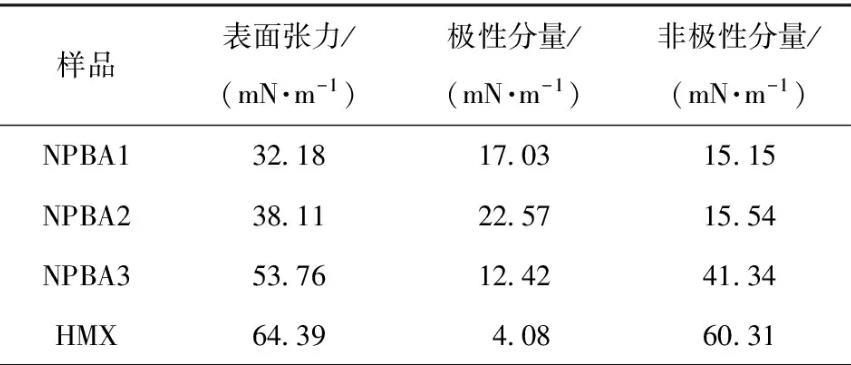 由表3中測試結(jié)果,應(yīng)用Owens-Wendt-Rabel-Kaelble(OWRK)表面張力計算方法,分別擬合得到3種NPBA和HMX的表面張力γ、極性分量γp和非極性分量γd(結(jié)果見表4),計算公式如下:
