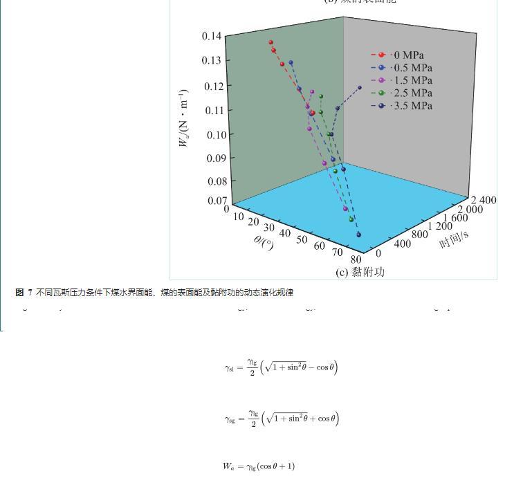 由圖7a可知,同一瓦斯壓力條件下,煤水界面能隨著潤(rùn)濕時(shí)間的增加而減小,隨著接觸角的減小而減小。因?yàn)槊核缑婺茉叫?,水分越容易在煤體表面鋪展。同一時(shí)刻,瓦斯壓力越大,煤水接觸角越大,煤水界面能越大,水分越不容易在煤體表面鋪展;由圖7b可知,同一瓦斯壓力條件下,煤的表面能隨著潤(rùn)濕時(shí)間的增加而增加,隨著接觸角的減小而增大。因?yàn)槊旱谋砻婺茉礁?,越容易被水?rùn)濕。同一時(shí)刻,瓦斯壓力越大,煤水接觸角越大,煤的表面能越小,水分越不容易在煤體表面鋪展;由圖7c可知,同一瓦斯壓力條件下,黏附功隨潤(rùn)濕時(shí)間的增加而增加,隨著接觸角的減小而增大。黏附功越大,越容易被水潤(rùn)濕。同一時(shí)刻,瓦斯壓力越大,煤水接觸角越大,黏附功越小,水分越不容易在煤體表面鋪展。因此,降低瓦斯壓力及延長(zhǎng)潤(rùn)濕時(shí)間有助于減小煤水界面能、增加煤的表面能及增加黏附功,進(jìn)而有助于提高水對(duì)煤的潤(rùn)濕效果。因此,采用煤層注水措施治理瓦斯及預(yù)濕減塵時(shí),應(yīng)給予煤體充分的潤(rùn)濕時(shí)間。