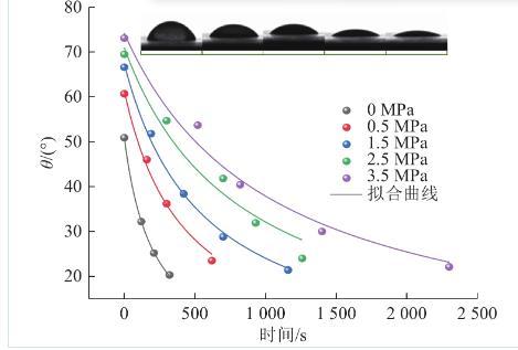 圖5不同瓦斯壓力下煤與水之間動(dòng)態(tài)接觸角