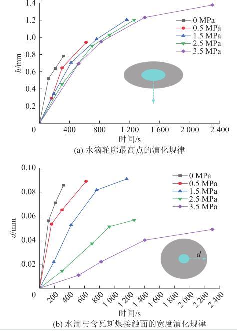 由圖9a可知,同一瓦斯壓力條件下,水滴輪廓最高點(diǎn)下降的高度逐漸增加,然而增加的速率逐漸減小,其主要是因?yàn)樗衷诿褐锌紫读鲃?dòng)所受的黏滯力所致。同一時(shí)間,瓦斯壓力越大,水滴輪廓最高點(diǎn)下降的高度越小。由前述分析可知,瓦斯壓力越大,水分對(duì)煤體潤(rùn)濕的難度越大,水分越難浸潤(rùn)含瓦斯煤體,因此呈現(xiàn)出瓦斯壓力越大,水滴輪廓最高點(diǎn)下降的高度越小的規(guī)律。由圖9b可知,同一瓦斯壓力條件下,水滴與含瓦斯煤接觸面的寬度逐漸增加,然而增加的速率逐漸減小,其主要也是因?yàn)樗衷诿褐锌紫读鲃?dòng)所受的黏滯力所致。同一時(shí)間,瓦斯壓力越大,水滴與含瓦斯煤接觸面寬度增加的越小,其說(shuō)明瓦斯壓力越高,水分越不容易在含瓦斯煤表面鋪展。水滴與含瓦斯煤表面的接觸是一個(gè)動(dòng)態(tài)潤(rùn)濕的過(guò)程,基于對(duì)圖9a—圖9b的分析可知,瓦斯壓力的增加一方面不利于水分浸潤(rùn)到煤體中,另一方面不利于水分對(duì)煤體表面潤(rùn)濕范圍的增加。