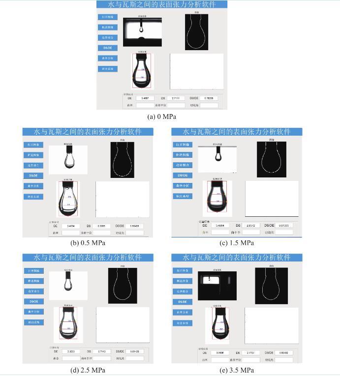 采用團(tuán)隊(duì)自開發(fā)的水與瓦斯之間的表面張力分析軟件對(duì)不同瓦斯壓力條件下的水滴形貌(圖3)進(jìn)行分析,即可獲得式(1)中的Ds及De。F為G修正后的形狀因子,F(xiàn)通過(guò)查表及插值法獲得,式(1)中的參數(shù)見表1,將表1中的參數(shù)帶入式(1)及式(2),即可獲得不同瓦斯壓力條件下水與瓦斯之間的表面張力(圖4)。
