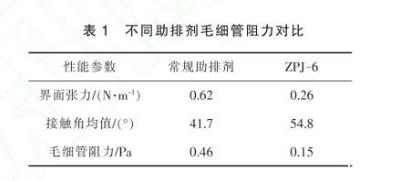 毛細(xì)管力的作用使流體流動(dòng)阻力增加,導(dǎo)致壓裂后壓裂液返排困難。如果地層壓力不能克服毛細(xì)管力,壓裂液濾液和殘?jiān)皆诹芽p表面,造成儲(chǔ)層孔隙堵塞和壓裂液無法返排,就會(huì)致使?jié)B透率降低,傷害儲(chǔ)層。為了減少壓裂液在地層的停留時(shí)間,須使用助排劑,降低壓裂流體的表面張力。以降低油水相間界面張力、增大與巖心表面接觸角兩方面為目標(biāo),選取不同助排劑進(jìn)行對(duì)比(見表1),優(yōu)選出具有較佳界面張力與接觸角平衡值的新型助排劑ZPJ-6。與常規(guī)產(chǎn)品相比,新型助排劑具有較低的界面張力和較高的接觸角,毛細(xì)管阻力相對(duì)減小。