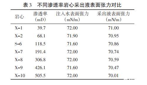 (1)實(shí)驗(yàn)方法采用芬蘭Kibron EZ-Pi Plus便攜式動(dòng)態(tài)表面張力儀檢測不同滲透率的巖心二次水驅(qū)采出液的表面張力。