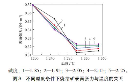 圖3不同堿度條件下燒結礦表面張力與溫度的關系