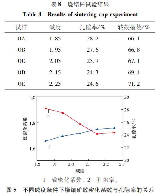 從表9可以看出,在堿度為1.85~2.15范圍內,隨著堿度的提高,燒結礦的孔隙率呈不斷降低趨勢,其轉鼓指數(shù)不斷增大,燒結礦強度增大。當堿度達到2.25時,相比前一堿度2.15,孔隙率略有增加,轉鼓指數(shù)稍有下降。原因可能是當堿度逐漸提高超過一定值(>2.15),燒結礦內逐漸產生更多硅酸二鈣晶型轉變引起的氣孔與微裂紋,透氣性反而略有提高,孔隙率反彈微升。