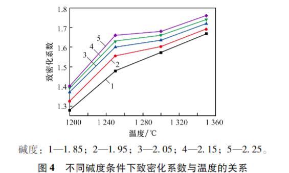 圖4不同堿度條件下致密化系數(shù)與溫度的關系