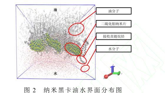 計(jì)算水分子、油相分子和納米黑卡之間的相互作用,截?cái)喟霃椒謩e為10?和12?。所構(gòu)建的油水界面體系由31 500個(gè)油分子和17693個(gè)水分子組成,并將納米黑卡置于所構(gòu)建的油水界面體系中。如圖2所示,油水界面上層部分的碳?xì)滏湵硎居头肿?,油水界面下層區(qū)域代表水分子。