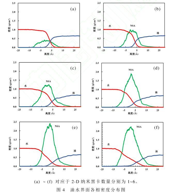 運用所構(gòu)建的油水界面模型,研究2-D納米黑卡(NSA)在油水界面的密度分布及吸附行為,模擬結(jié)果如圖4所示。納米黑卡數(shù)量增加時,界面處油相密度變化幅度大。這是由于隨著納米黑卡數(shù)量的增加,接枝的直鏈烷烴與油相相互作用不斷增強所致。當體系達到平衡狀態(tài),納米片大部分浸沒在水相中,直鏈烷烴主要浸沒在油相中。此時,納米黑卡所處的平衡位置受到納米黑卡重力和分子間相互作用力的影響很大,分子間相互作用力包括范德華力和靜電力。納米片偏親油性,顯示出與油水分子間的弱范德華力,而直鏈烷烴與油相分子間存在強范德華力,因此納米片被拉向油相。隨著納米黑卡數(shù)量的增加,油水界面納米片的密度隨之增加。納米黑卡的密度在中線附近出現(xiàn)峰值,當納米黑卡數(shù)量增至4片后繼續(xù)增加黑卡數(shù)量,在中線部分納米黑卡的密度增加量并不明顯,只是高峰變寬了。