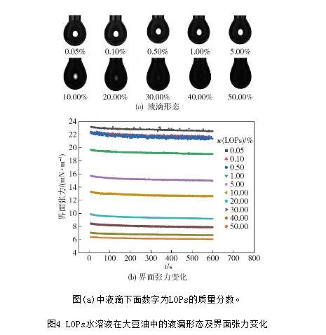 不同質量分數的LOPs在油相中的液滴形態(tài)及界面張力變化見圖4。由圖4(a)可以判斷LOPs在純化大豆油中存在擴散過程,且隨著LOPs質量分數的增大,液滴的透光性漸無。這可能是因為低質量分數的LOPs之間存在親水性氨基酸的互斥作用,從而使得LOPs傾向于擴散至油水界面處,而隨著LOPs質量分數的繼續(xù)增加,LOPs持續(xù)擴散至界面處直至體系達到飽和狀態(tài)而失去透光性。由圖4(b)可知,無論LOPs的質量分數多大,其在短時間內作用于油水間的界面張力無明顯下降,說明短時間內LOPs并沒有快速吸附到油水界面,LOPs并沒有降低油水間界面張力的能力。