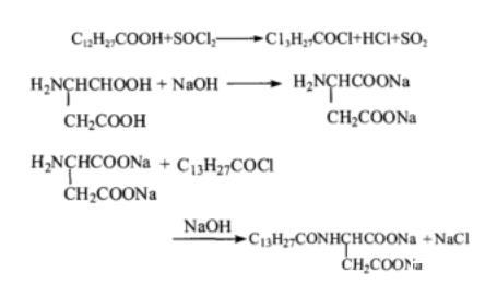 先合成十四酰氯和天冬氨酸鈉,然后再將十四酰氯與天冬氨酸鈉反應(yīng)得到目標(biāo)產(chǎn)物N-十四酰基天冬氨酸鈉。