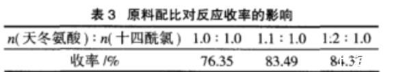 采用天冬氨酸稍過量,一方面可以抑制酰氯的水解,另一方面又有利于提純。選取n(天冬氨酸)∶n(十四酰氯)=1.0~1.2∶1.0。在反應體系pH=10~11、反應時間3.5h、反應溫度5℃條件下,考察不同原料配比對反應的影響,結(jié)果如表3所示。