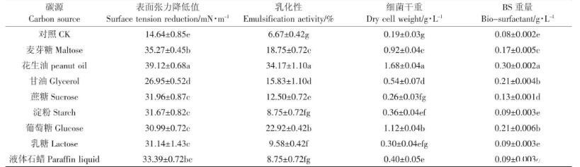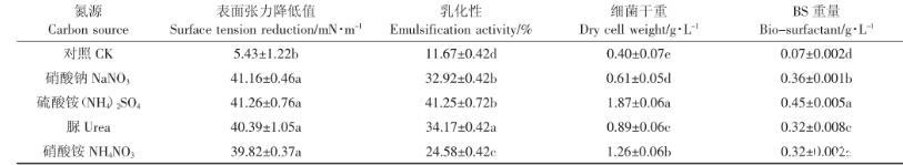 碳源對(duì)細(xì)菌的生長(zhǎng)與發(fā)酵產(chǎn)物量有重要影響。銅綠假單胞菌(Pseudomonas aeruginosa)可在多種類型碳源下產(chǎn)生生物表面活性劑,包括甘油、乙醇、植物油等。由表3可知,以花生油為碳源,細(xì)菌發(fā)酵液的降低值為39.12 mN·m-1,明顯高于其他碳源類型;乳化值為34.17%,稍高于其他碳源,此時(shí)細(xì)菌生物量最大,糖脂含量最高,為0.30 g·L-1。雖然花生油作為碳源,能夠促進(jìn)菌株產(chǎn)生更多生物表面活性劑,但如果用于實(shí)際生產(chǎn),成本相對(duì)較高,近年來一些研究者嘗試使用成本較低的工業(yè)副產(chǎn)物如糖蜜、廢潤(rùn)滑油等作為碳源,發(fā)現(xiàn)也具有很好的促進(jìn)微生物產(chǎn)生生物表面活性劑的作用。因此,后期會(huì)考慮選擇用一些低成本碳源進(jìn)行發(fā)酵。