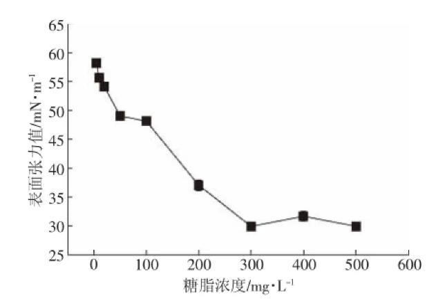 發(fā)酵產(chǎn)物臨界膠束濃度是指分子在溶劑中締合形成膠束的最低濃度。臨界膠束濃度(Critical micelle0.005 concentration,CMC)可以作為表面活性劑表面活性的一種度量,CMC越小,改變表/界面性質(zhì),起到增溶、乳化等所需的濃度就越低。從圖3可以看出:糖脂在0~300 mg·L-1時(shí),表面張力值隨著糖脂濃度的升高而降低,且在300 mg·L-1時(shí)達(dá)到最小值;在300~500 mg·L-1時(shí),表面張力值變化不大。可得發(fā)酵粗提產(chǎn)物的CMC為300 mg·L-1,明顯低于普通化學(xué)表面活性劑十二烷基磺酸鈉(SDS)的2200 mg·L-1,能在較低濃度下使用,因而在醫(yī)藥、食品、化工等行業(yè)具有廣闊應(yīng)用前景。