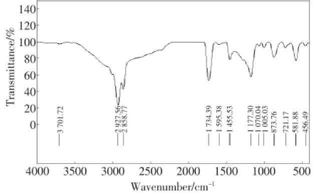 將菌株147產(chǎn)物提純,紅外光譜儀(FT-IR)分析物質(zhì)結(jié)構(gòu),結(jié)果如圖2。該物質(zhì)在3701.72cm-1處有吸收峰,表明分子中有羥基存在;2 858.77~2 927.56 cm-1處的吸收峰表明存在糖類C-H的伸縮振動(dòng),1400~1200 cm-1處是C-H變角振動(dòng),1 734.39 cm-1處是C=O的雙鍵振動(dòng),而1 070.04 cm-1處為C-O-C鍵伸縮振動(dòng),因此該物質(zhì)中有一個(gè)五元環(huán)狀內(nèi)酯和糖苷鍵存在。由此進(jìn)一步證明該生物表面活性劑含糖脂類物質(zhì)。