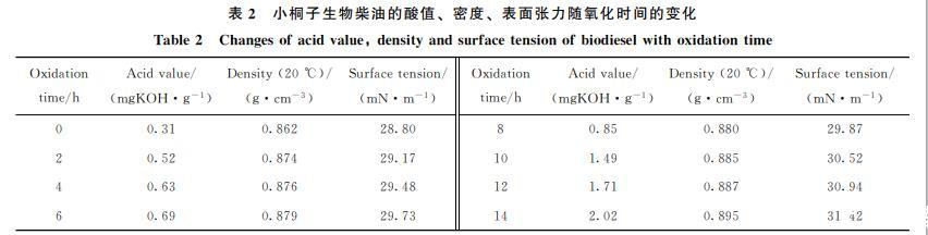 不同氧化時間小桐子油生物柴油的酸值、表面張力與密度的測定結(jié)果如表2所示。從表2可得,氧化14h的小桐子生物柴油的酸值由未被氧化時的0.31 mgKOH/g增加到2.02 mgKOH/g,增加了551%,超過ASTM D6751(2001)中規(guī)定生物柴油酸值的最大值(0.5 mgKOH/g)。這是由于小桐子生物柴油在氧化后期形成了一些醛類,如己醛和壬醛(見表1),這些醛類經(jīng)過復(fù)雜的二次氧化反應(yīng)轉(zhuǎn)化為酸類物質(zhì),從而導(dǎo)致酸值增加;同時,生物柴油會吸收水分,導(dǎo)致酯的水解,也可使酸值增加。