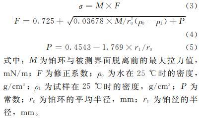式中:M為鉑環(huán)與被測界面脫離前的最大拉力值,mN/m;F為修正系數(shù);rho_0為水在25℃時的密度,g/cm3;rho_1為試樣在25℃時的密度,g/cm3;P為常數(shù);r_0為鉑環(huán)的平均半徑,mm;r_1為鉑絲的半徑,mm。