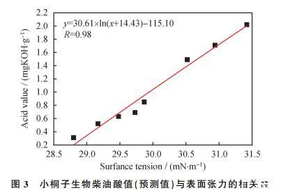 (2)通過氧化實(shí)驗(yàn)得到的小桐子生物柴油的酸值與表面張力相關(guān)系數(shù)為0.99,表明可用表面張力預(yù)測(cè)酸值;比較4種預(yù)測(cè)模型的精度分析結(jié)果,確定對(duì)數(shù)模型(y=30.61x ln(x+14.43)-115.10)精度最高,其預(yù)測(cè)均方根誤差REMSP值及相關(guān)系數(shù)R分別為0.0937和0.9879,酸值預(yù)測(cè)值與真實(shí)值誤差為2.95%。