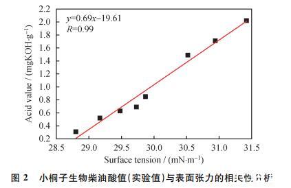 同時(shí),對(duì)樣品的酸值與表面張力進(jìn)行了相關(guān)性分析,如圖2所示: