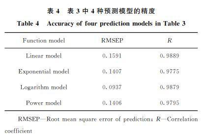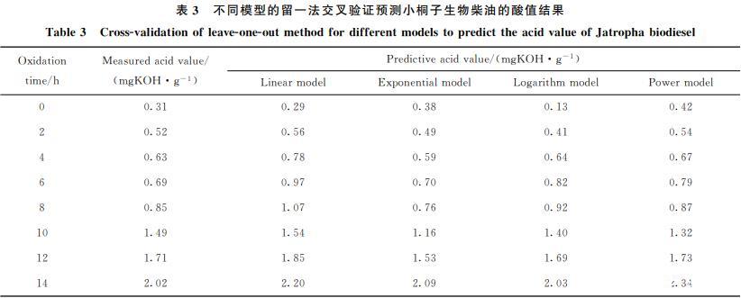 留一法交叉驗(yàn)證是建立預(yù)測(cè)模型的一種常用方法,從N個(gè)觀測(cè)數(shù)據(jù)中選擇一個(gè)觀測(cè)數(shù)據(jù)作為驗(yàn)證數(shù)據(jù),然后使用剩下的(N-1)個(gè)觀測(cè)數(shù)據(jù)擬合一個(gè)模型,并用驗(yàn)證數(shù)據(jù)來驗(yàn)證模型的精度,如此重復(fù)N次??紤]到數(shù)據(jù)量以及相關(guān)性,筆者利用Excel建立了線性、指數(shù)、對(duì)數(shù)、乘冪4種預(yù)測(cè)模型,對(duì)小桐子生物柴油酸值的預(yù)測(cè)結(jié)果見表3。